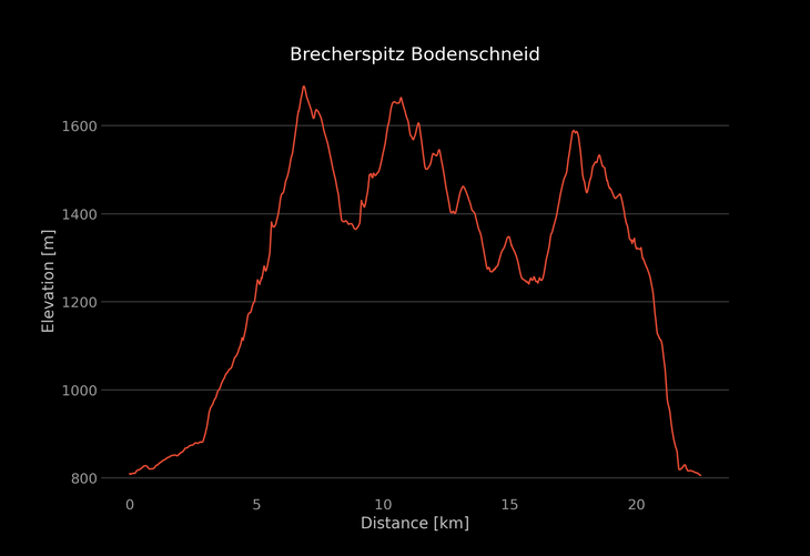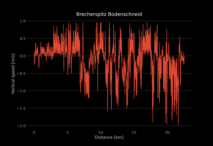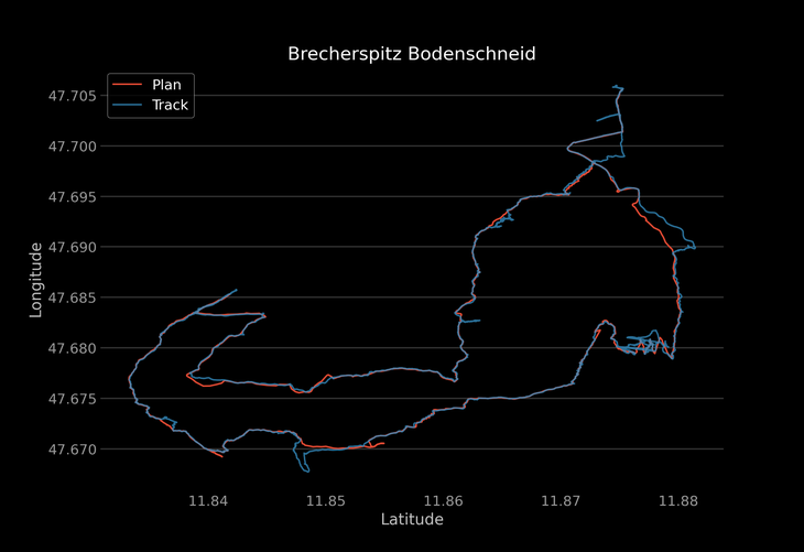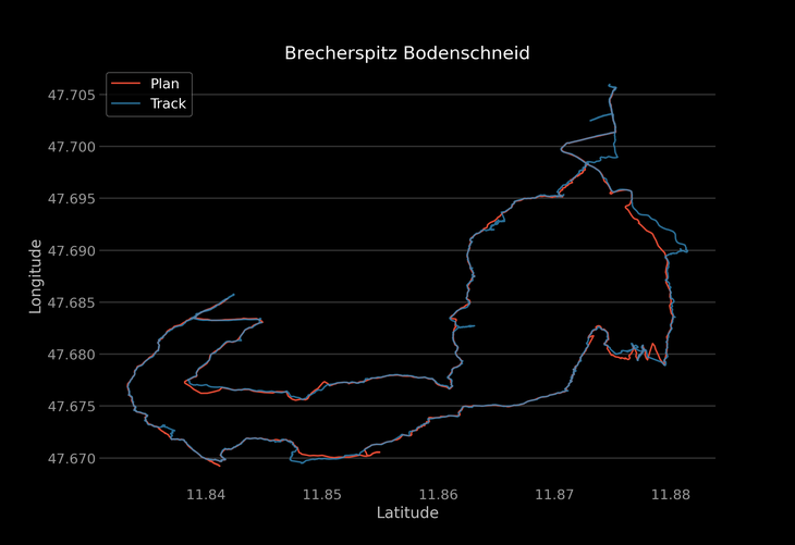 importosimportpandasaspdimportmatplotlib.pyplotaspltimportgpxpyfromgeopyimportdistanceimportfoliumdefload_gpx(file_name):gpx=gpxpy.parse(open(file_name))track=gpx.tracks[0]segment=track.segments[0]print(f"File: {file_name}")print(f"Points: {len(segment.points)}")print(f"Length: {segment.length_2d()/1000:.1f} km")print(f"Up: {segment.get_uphill_downhill().uphill:.0f} m")print(f"Down: {segment.get_uphill_downhill().downhill:.0f} m\n")# Load the data into a Pandas dataframe (by way of a list)data=[]forpoint_idx,pointinenumerate(segment.points):data.append([point.longitude,point.latitude,point.elevation,point.time,segment.get_speed(point_idx)])columns=['long','lat','ele','time','speed']gpx_df=pd.DataFrame(data,columns=columns)# Calculate elevation diff, cumulative distance and vertical speedgpx_df['ele_d']=gpx_df.ele.diff(1)gpx_df=get_distance(gpx_df)ifsegment.has_times():gpx_df['td']=(gpx_df.time.diff(1)).astype('timedelta64[s]')gpx_df['vert_speed']=gpx_df.ele_d/gpx_df.tdreturngpx_dfdefget_distance(_df):_df=_df.reset_index(drop=True)_df['dist']=0.0forpntin_df.index[1:]:_df.dist.iat[pnt]=distance.distance((_df.lat.iat[pnt-1],_df.long.iat[pnt-1]),(_df.lat.iat[pnt],_df.long.iat[pnt])).meters+_df.dist.iat[pnt-1]return_dftour='brecherspitz'df_plan=load_gpx(os.path.join(tour,'plan.gpx'))df_track=load_gpx(os.path.join(tour,'track.gpx'))