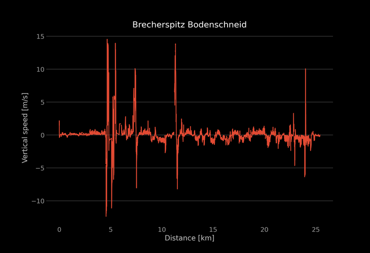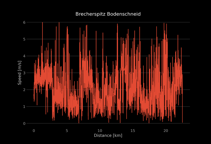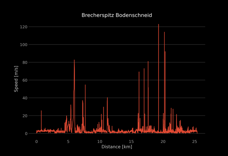 Also the speed shows some faulty peaks which often correlate with the wrong elevation data. We were not more than ten times faster (~120 m/s) than Usain Bolt. Even during our downhills 😉. The time data only has second accuracy. So this can lead to wrong speed if the two datapoints