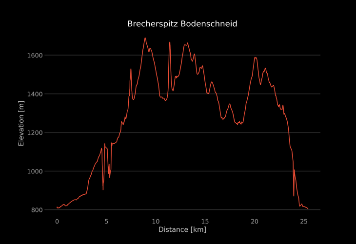 Analyzing and plotting the data reveals its some flaws. First the elevation profile has some false peaks at 5, 7, 12 and 24 km. They are